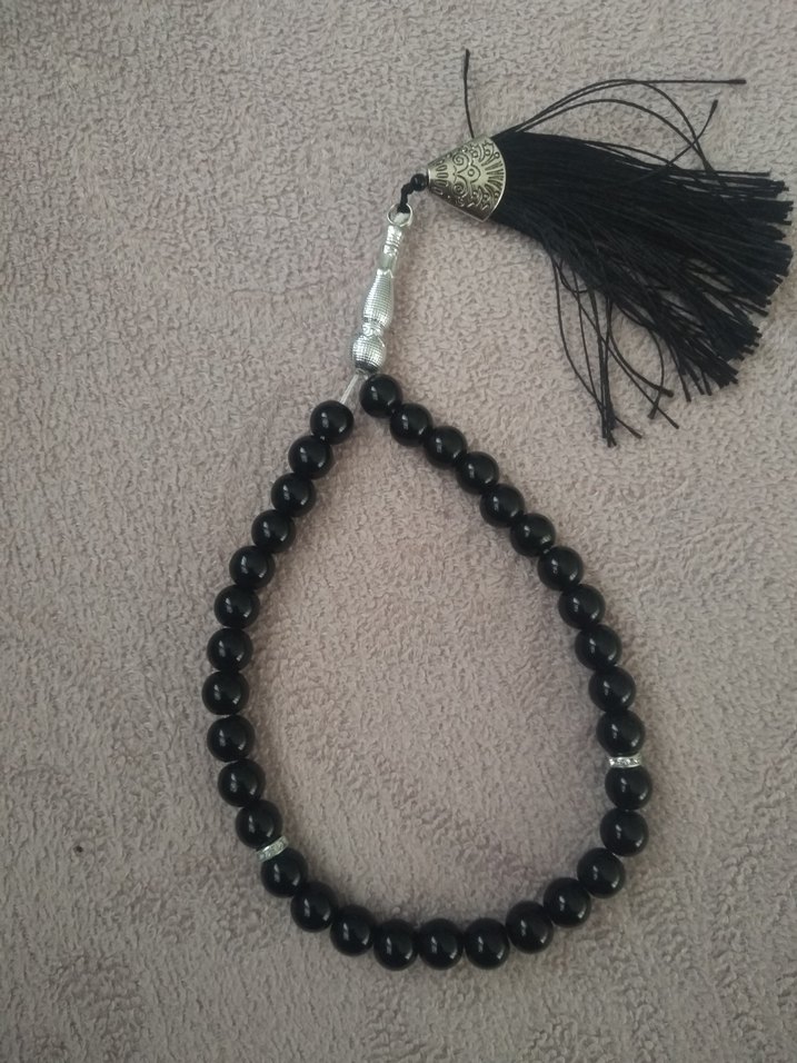 Siyah boncuklar ve gümüş detaylar ile gotik tarzda, dekoratif püsküllü erkek tesbih.