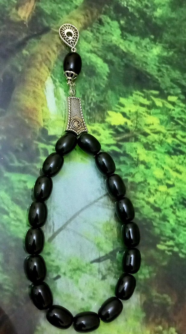 Siyah gotik tarzda, ay ve yıldız detaylı gümüş püsküllü erkek tesbih.