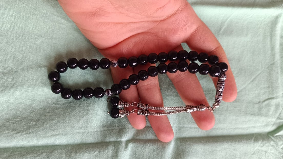 Parlak siyah boncuklardan oluşan, gotik tarzda erkek tesbihi, metal püsküllerle tamamlanmıştır.