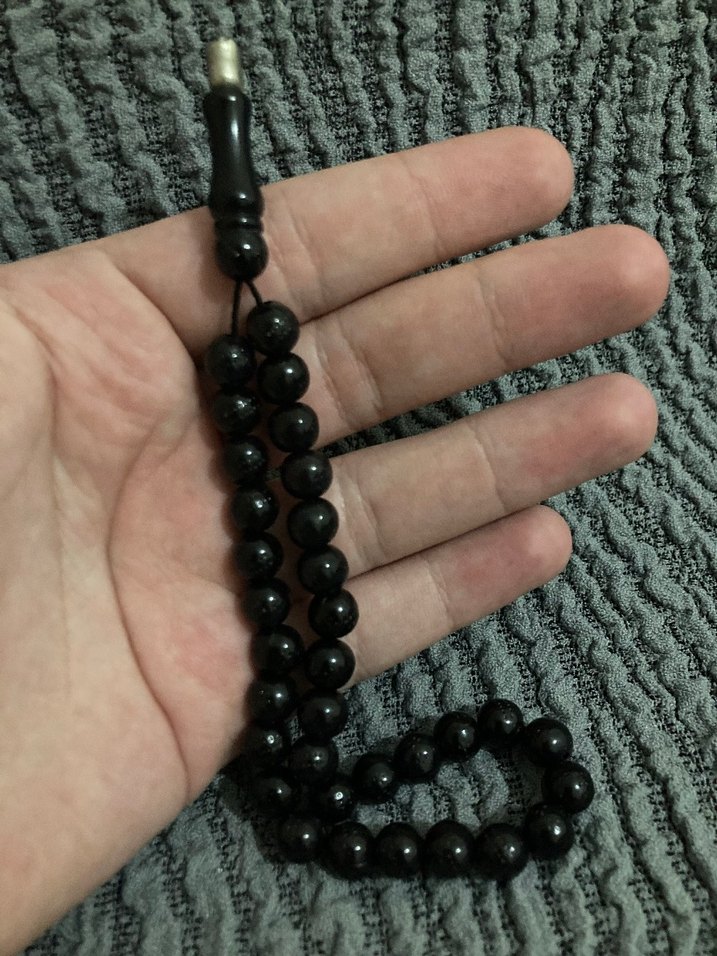 Siyah renkli, yuvarlak boncuklardan oluşan gotik tarzda erkek tespih. Koyu renk ve sade tasarımıyla dikkat çeker.