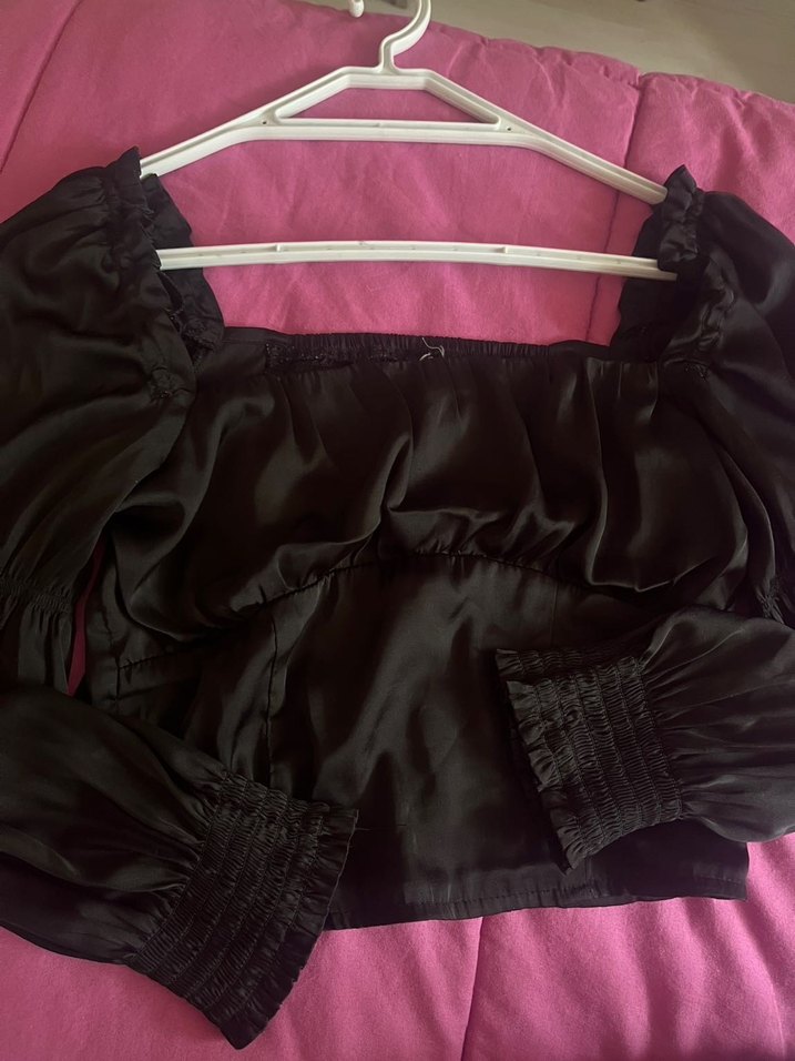 Saten dokulu, siyah renkli ve fitted kesim bluz. Kayık yaka ve fırfırlı detaylara sahiptir. Gotik tarzda, romantik akşamlar için uygundur.
