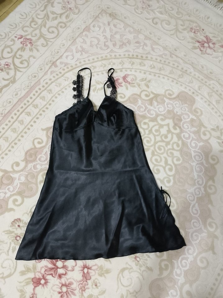 Siyah renkli, ince askılı ve midi boyda, vücuda oturan gotik tarzda düz gecelik. Yumuşak ve koyu renkte kumaştan üretilmiştir. dantelli derin sırt dekoltesi sırtında dantel modelli