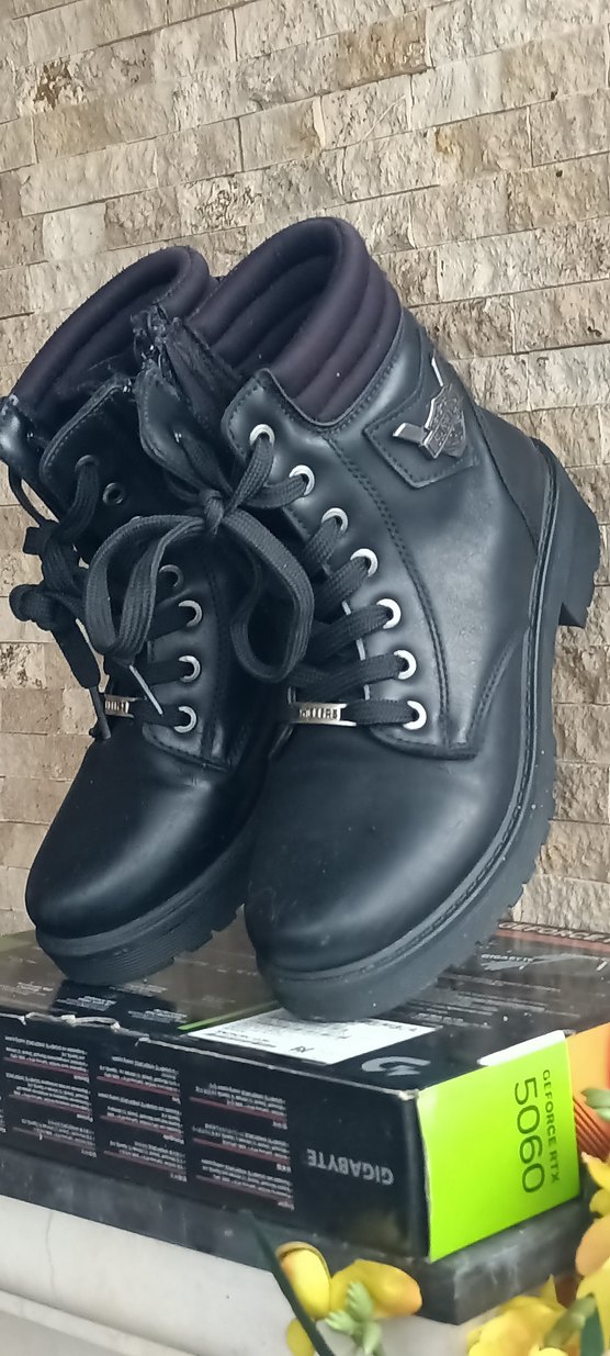 Siyah kauçuk kadın botları, blok topuklu ve tokalı detaylarla gotik tarzda. Günlük kullanım için uygun, rock punk havası taşıyor. Desensiz ve koyu renkte. Botun fermuarları bozuk yepyeni başka bir sıkıntısı yok 35.5 daha rahat olur marka temsili