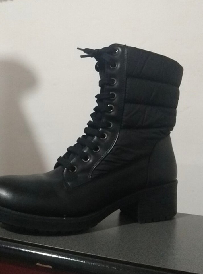 Siyah gotik kadın botu, bacıklı ve blok topuklu. Kauçuk malzemeden üretilmiş, bağcıklı ve dolgulu üst kısmı ile rahatlık sağlar. Günlük kullanıma uygun, trend bir görünüm sunar.