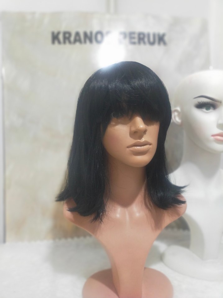 Siyah plastikten yapılmış gotik tarzda kadın peruk, cesur ve zahmetsiz şıklık sunar. Koyu ve canlı renklidir.