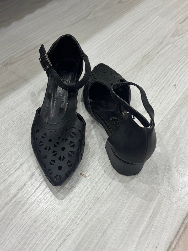 Siyah, tokalı ve blok topuklu gotik kadın sandaletleri. Kauçuk malzemeden, kesik desenli ve desensiz, günlük kullanım için uygundur.