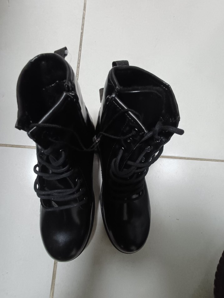 Siyah lastik, stiletto topuklu, tokalı ve bağcıklı kadın botları. Gotik ve rock punk tarzıyla günlük kullanım için uygun, desensiz ve koyu renkte.