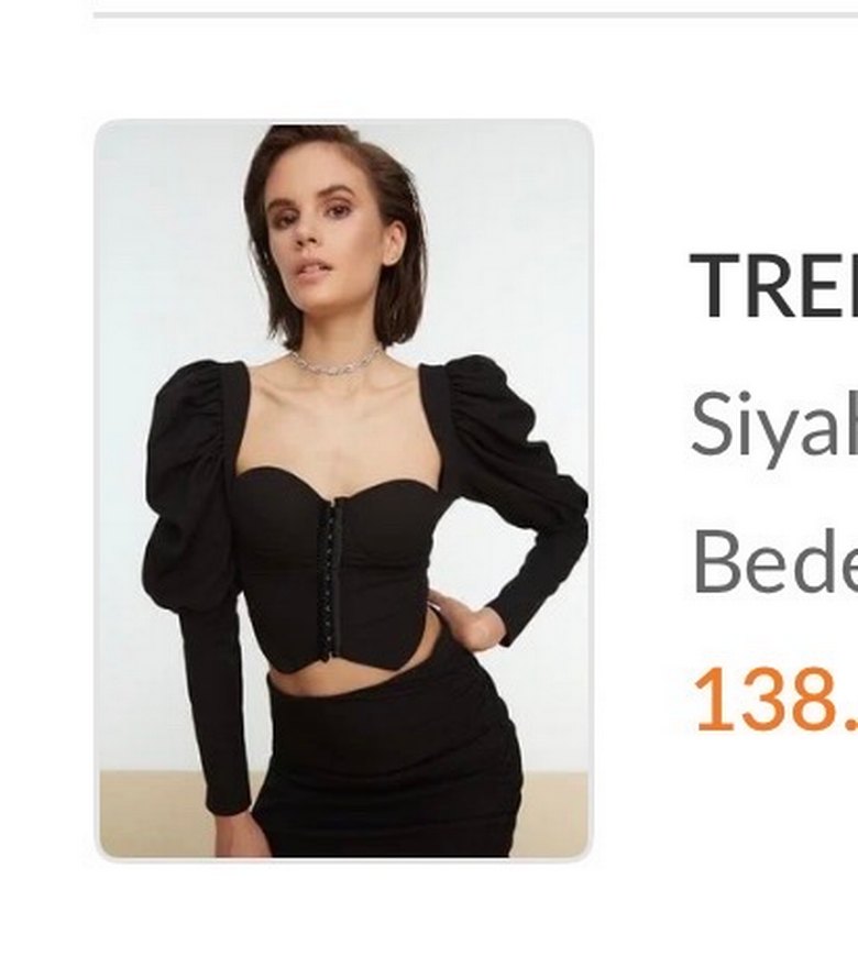 Siyah, v yaka, uzun balon kollu, önden düğmeli, kısa mini bluz. Sentetik kumaştan yapılmıştır. Bana olmadığı için hiç giyemedim