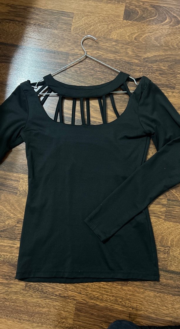 Siyah, uzun kollu, kayışlı detaylara sahip, gotik tarzda, vücuda oturan bluz. Yumuşak sentetik kumaştan yapılmıştır. Şık ve farklı giyinmeyi sevenlere.