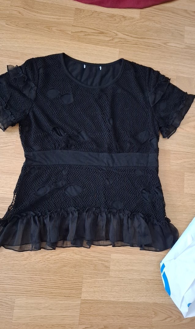 Siyah renkte, kısa kollu ve yuvarlak yaka olan bu bluz, yumuşak sentetik kumaştan üretilmiştir. Fırfır detayları ve gotik tarzıyla öne çıkar.