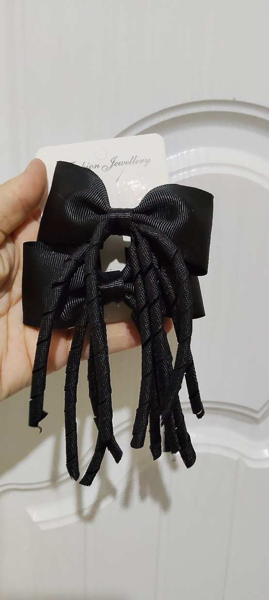 Sentetik kumaştan yapılmış, gotik tarzda siyah kurdele ve sarkan kıvrımlı ip detaylı saç aksesuarı.