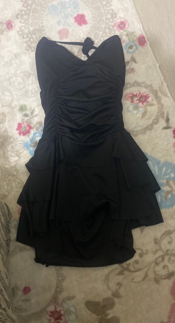 Bu siyah elbise, vücuda oturan kesimi ve kat kat fırfır detaylarıyla gotik parti tarzına uygundur. İnce askılı ve midi boydadır.