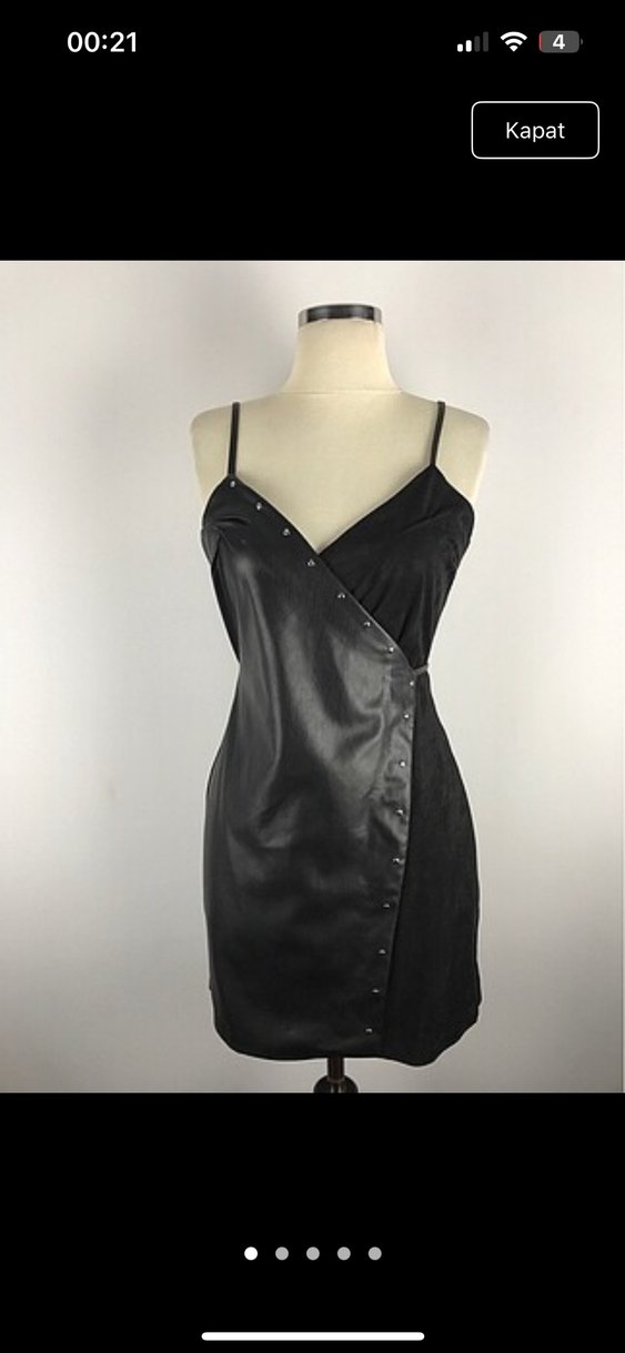 V yaka, ince askılı ve düğmeli detaylara sahip siyah, vücuda oturan midi elbise. Gotik tarzda cesur görünüm için ideal.