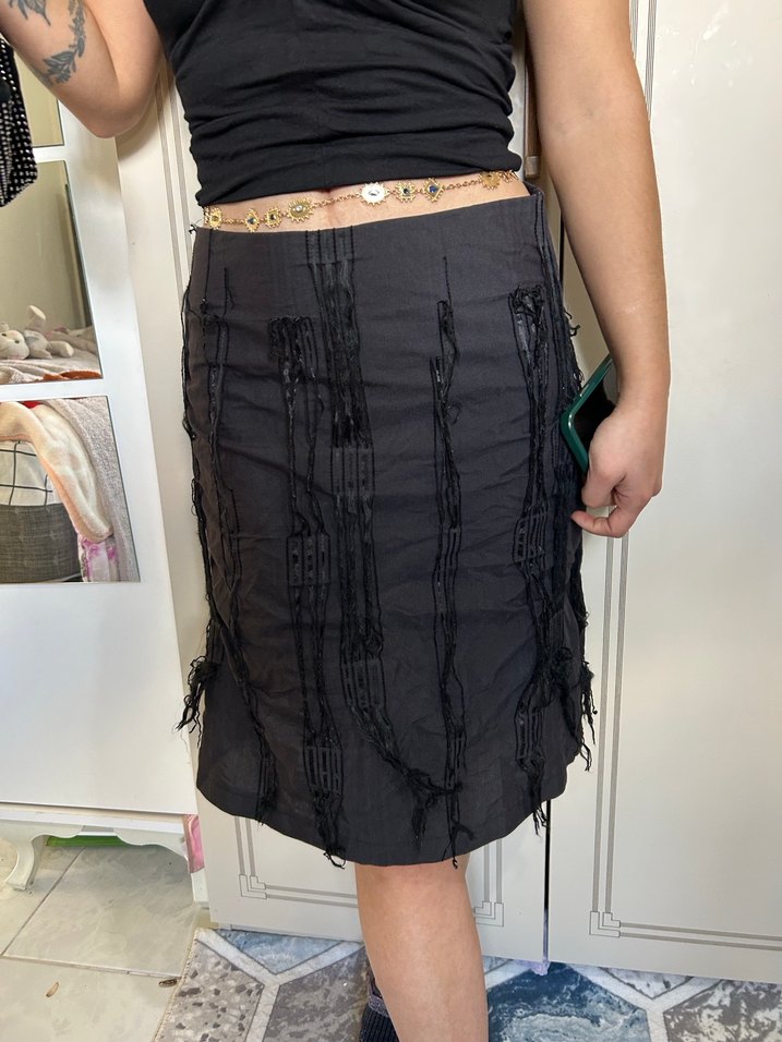Fairycore ve gotik estetiği mükemmel bir şekilde harmanlayan bu siyah mini etek, üzerindeki dikey şerit detayları ve püsküllü dokusuyla hem gizemli hem de çok tarz bir duruş sergiliyor; 38/M beden uyumlu olan bu parça, yeni yıkandı, tertemiz ve sorunsuz bir şekilde yeni sahibini bekliyor. Vintage ruhunu yansıtan eskitme detayları ve hareketli yapısıyla grunge kombinlerinizin vazgeçilmezi olacak bu etek, ister postallarla ister babetlerle tamamlayın, her ortamda tüm bakışları üzerinize çekecek bir karakteristikliğe sahip. #vintage #fairycore #gothic #grunge #y2k #blackskirt #38beden #temizurun #estetik #indie #dolap #ikinciel #gotik #puskulluetek