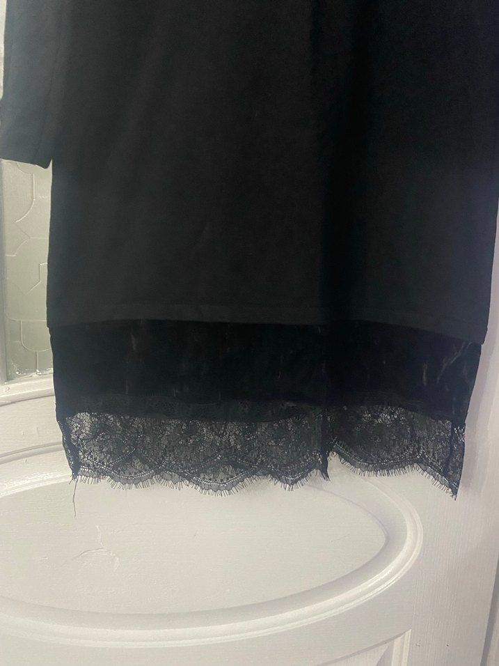 Siyah gotik midi elbise, uzun kollu ve bol kesimdir, etek kısmında dantel detay bulunur.