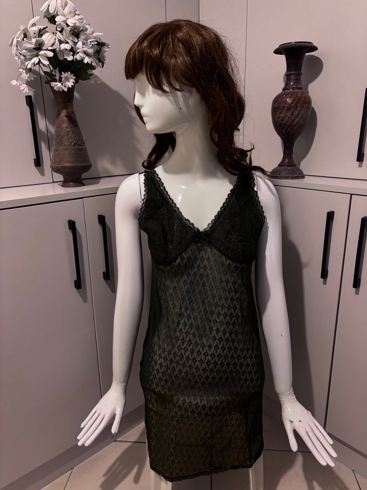 Siyah, vücuda oturan midi uzunlukta, kolsuz gotik tarzda kadın gecelik. Kumaşı yumuşak dokulu ve ince desenlidir. S/M/L uyumlu