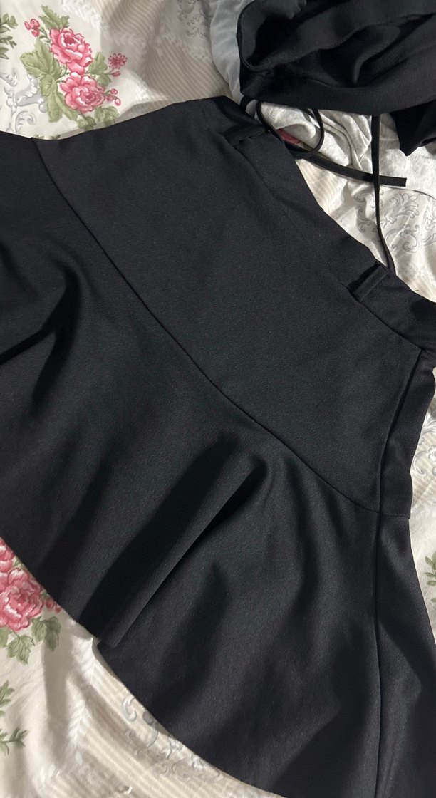 Düz siyah, sentetik kumaştan yapılmış, oturan kesim gotik midi mini etek, fırfır detayıyla günlük kullanıma uygun.