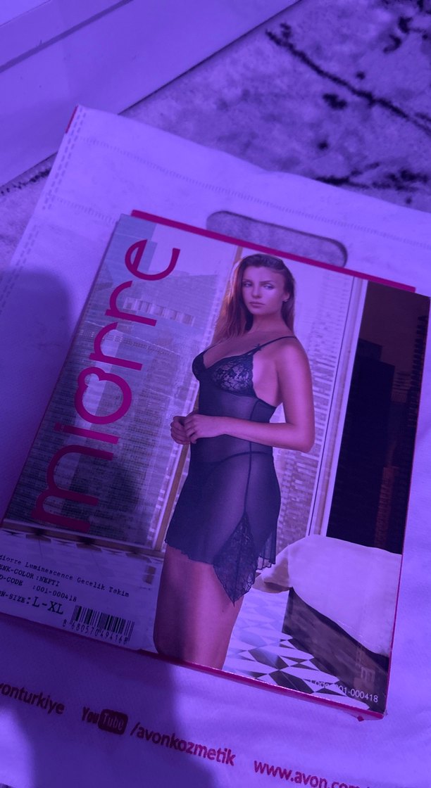 Siyah, gotik tarzda, ince askılı ve desen içermeyen midi uzunlukta, vücuda oturan gecelik. Beden L-XL'dir.
