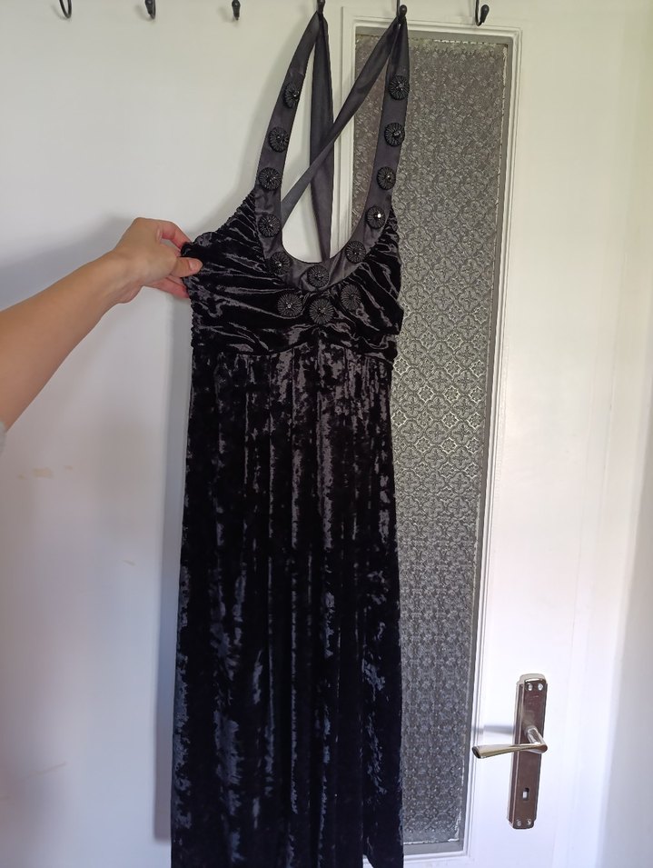 Siyah gotik midi elbise, strappy V yaka ve drapeli detaylara sahip, parti için uygun şık. boyu diz mesafesinden biraz yukarida uzun degil