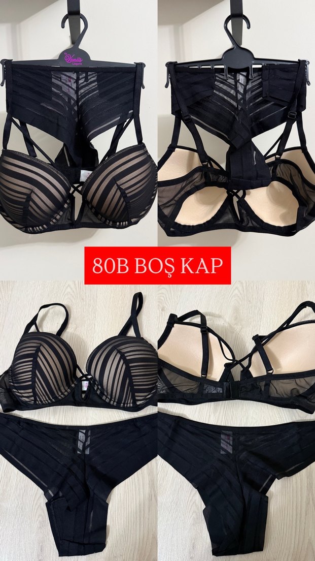 Siyah gotik tarzda, 80B beden, boş kaplı sütyen ve midi uzunlukta takımıdır. Desensiz, koyu renklidir.