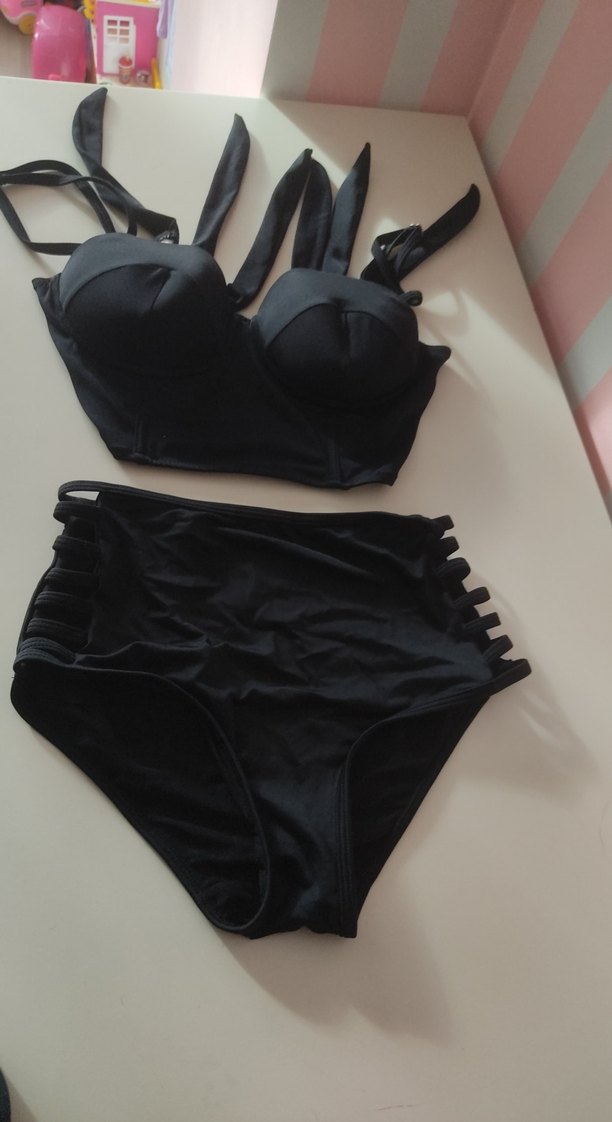 Siyah gotik stile sahip, ince askılı ve kısa kesim bikini takımı. Üst kısmı destekli, altı yüksek bel ve yanlardan kesikli, cesur ve şık görünüme sahip.