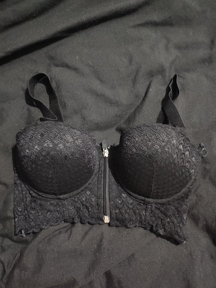 Siyah renkli, kısa kesim gotik tarzda dantel detaylı ve önü fermuarlı sütyen.