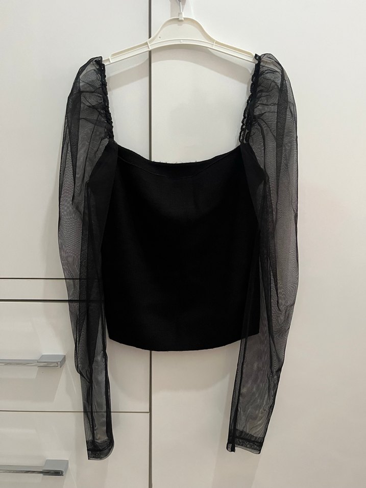 Boyu:32cm eni:29cm 1 defa kullanıldı. Sorunsuz. Tertemiz. S-M beden uyumlu.Kolları tül triko bluz. Markasını hatırlamıyorum. Etiketi rahatsız ediyor diye çıkartmıştım. Siyah, dar kesim gotik bluz, tekne yaka ve uzun, drapeli tül kollarla tasarlanmıştır. Günlük kullanım için uygundur.