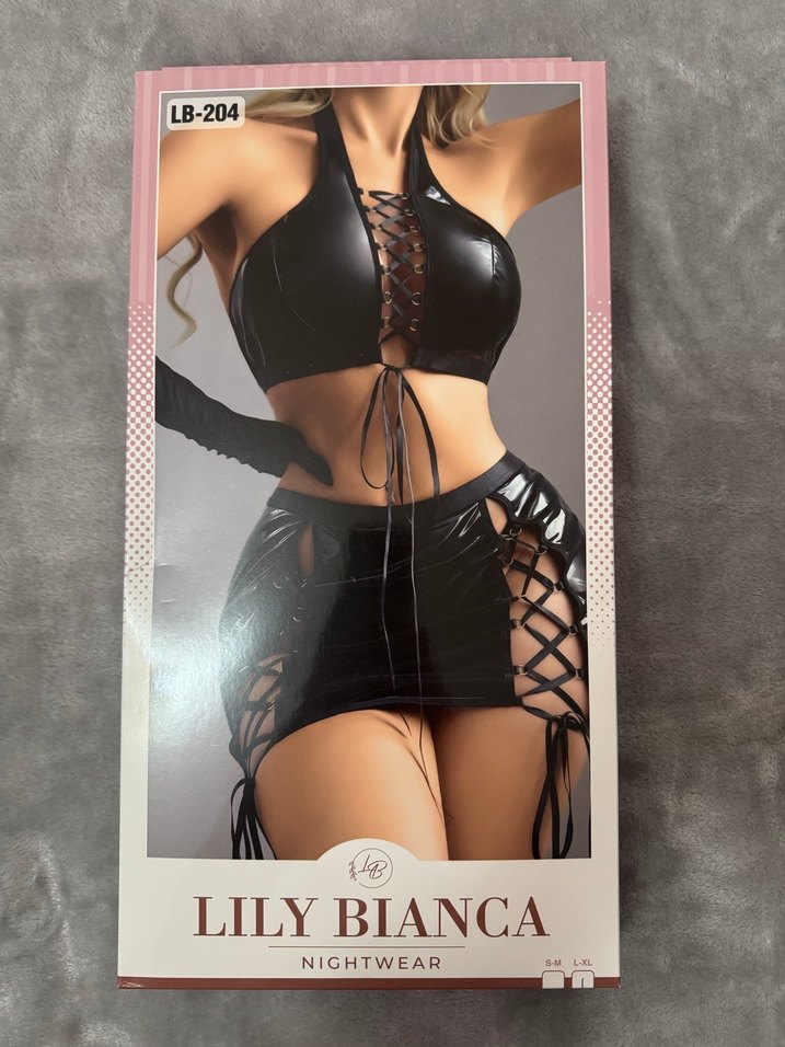 Siyah renkte, bağcıklı gotik mini gecelik. Vücuda oturan kesim, kısa boy. Lily Bianca markası.
