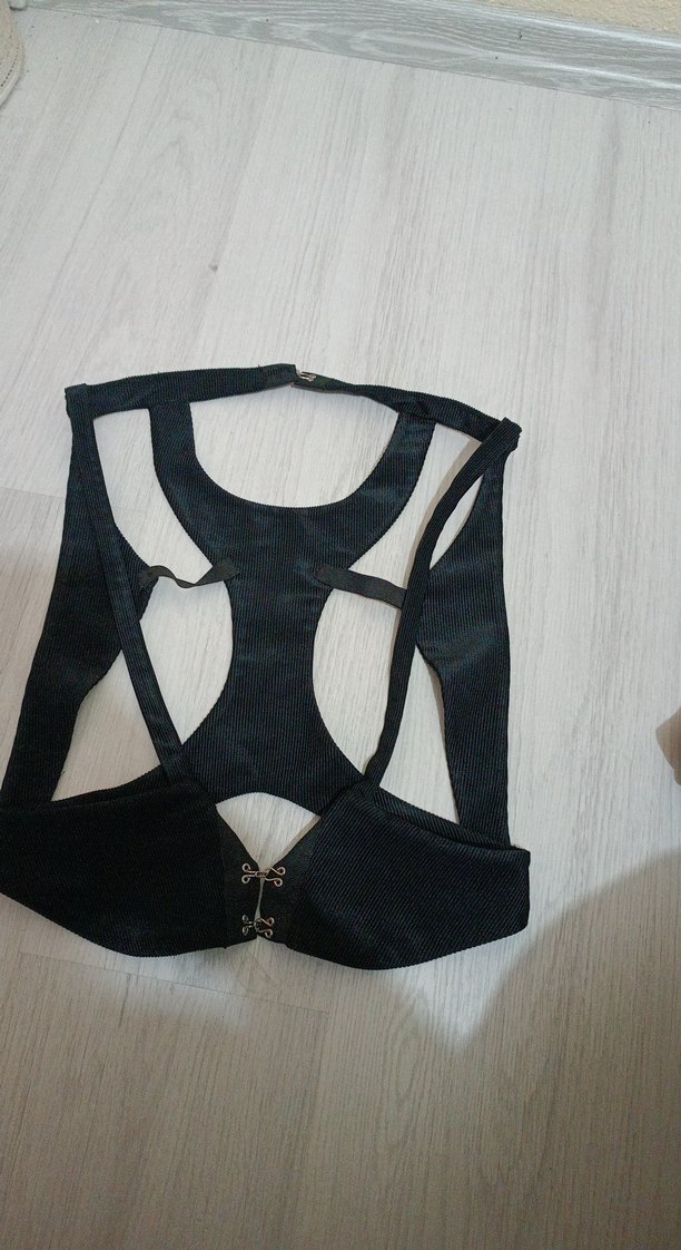 Siyah renkli, sentetik kumaştan yapılmış, halter yaka ve askılı detaylara sahip, kemerli ve gotik tarzda mini boyda dar kesim bir büstiyerdir.