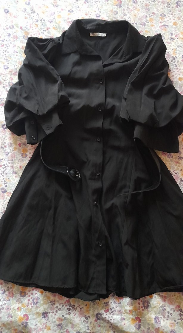 Siyah renkte, bol kesim ve askılı kollara sahip gotik tarzda mini uzunlukta kadın elbisesi. Düğmeli ön kısmı ve desensiz tasarımı vardır.