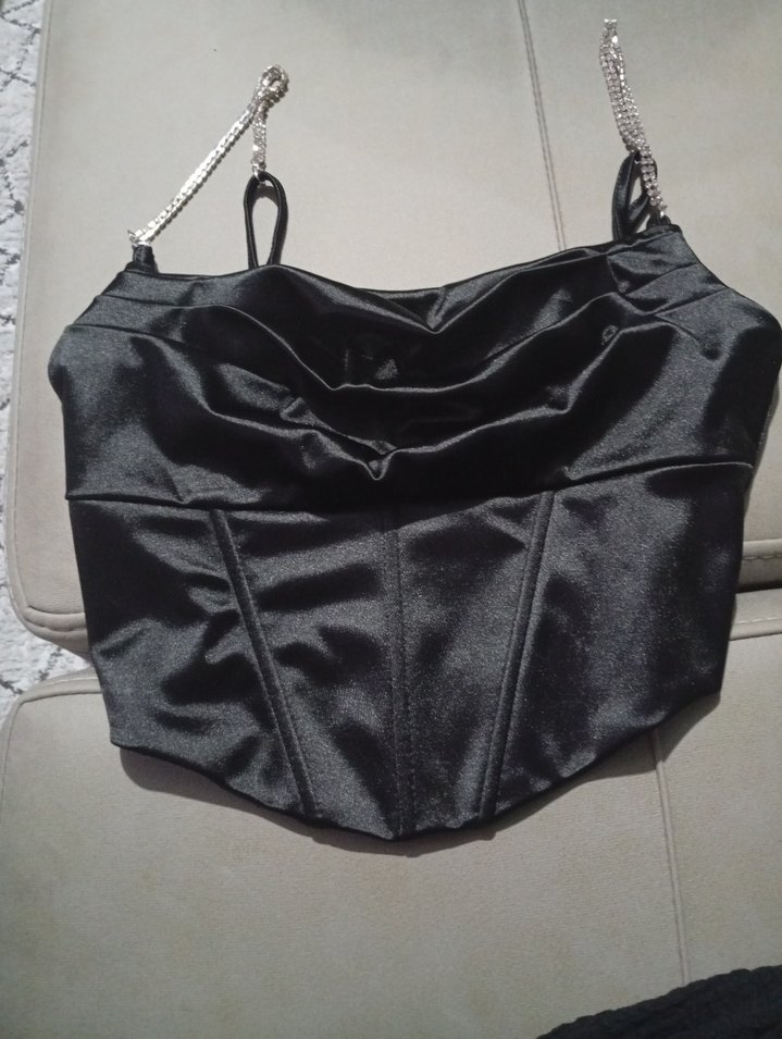 Sıfır ayarında . Siyah, straplez yaka ve ince askılı, tokalı detaylı, vücuda oturan gotik stil mini büstiyer. Pürüzsüz sentetik kumaştan, parti için uygun.