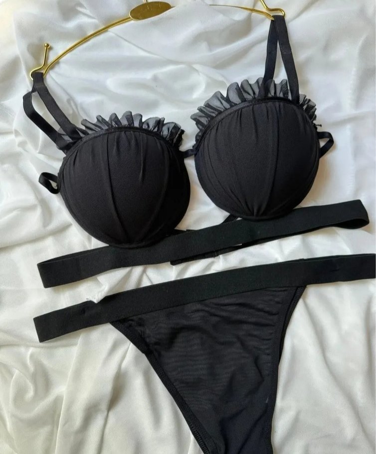 Siyah gotik tarzda, mini uzunlukta sütyen ve külot takımı. Fırfırlı detaylar ve ince askılar Parisian alt kültüründen esinlenmiştir.