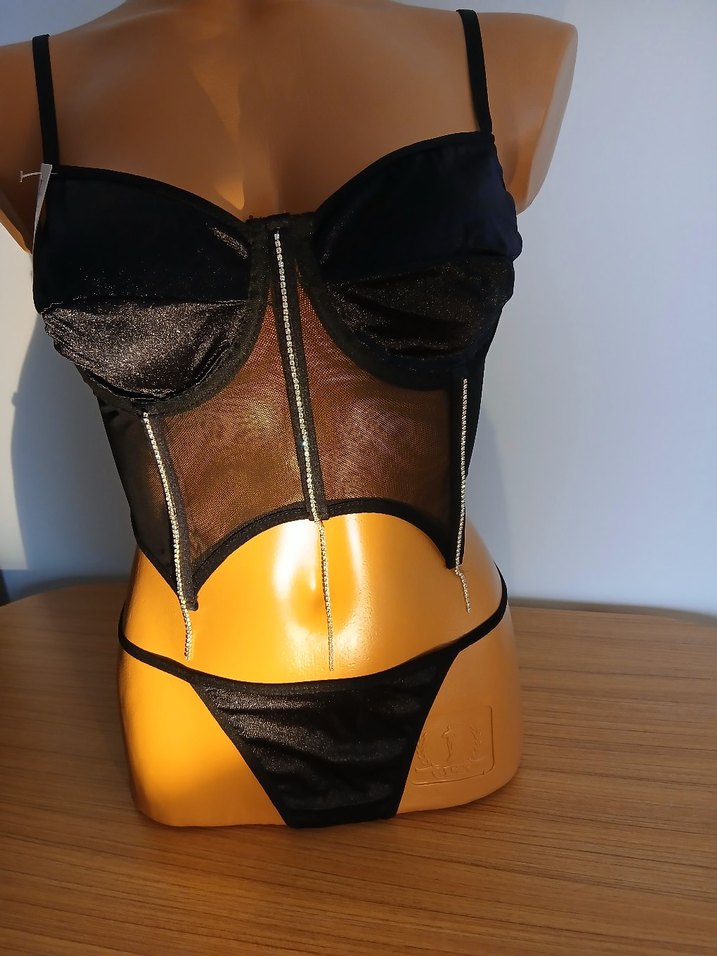 Alt S/M, L/XL, Üst 75/S, 80/M, 90/XL beden. Siyah gotik tarzda, kısa boylu sütyen takımı, şeffaf tül paneller ve zincir detaylarıyla karanlık ve iddialı bir görünüm sunar.