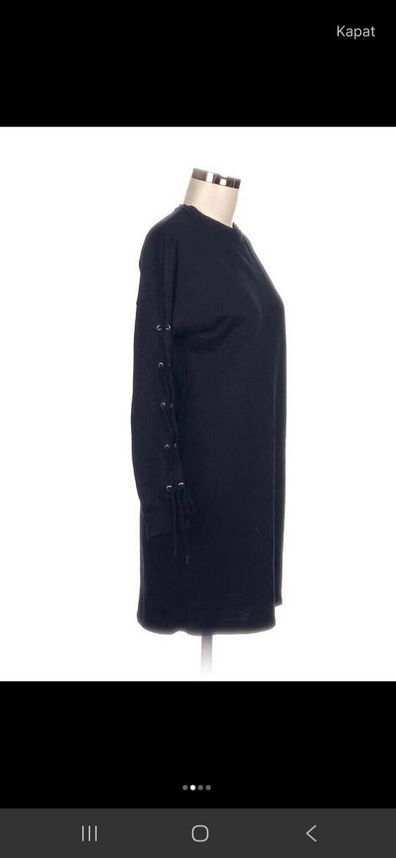 Siyah, fitted kesim kadın elbise, uzun kollu ve düğmeli detaylara sahip. Nakışlı desenleri ve bisiklet yakası ile normal midi boyunda, sentetik kumaştan üretilmiştir.