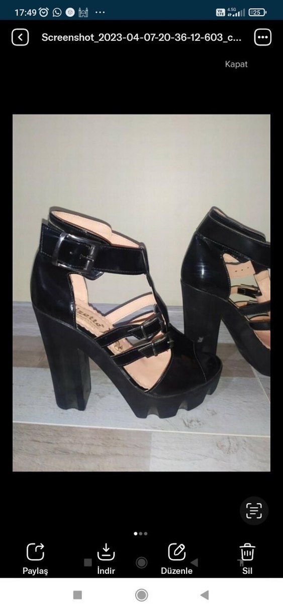 Siyah, tokalı bantlara sahip gotik tarzda platform topuklu kadın ayakkabısı. Kauçuk malzemeden, günlük kullanıma uygun baskılı desenli.