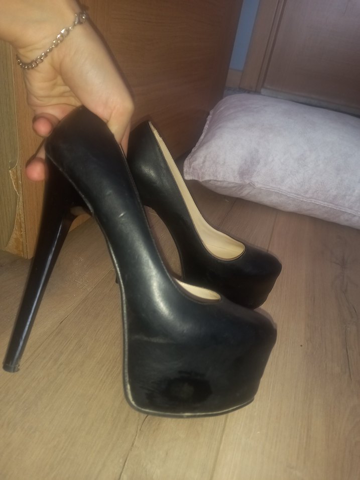Siyah platform topuklu, yüksek topuklu ve tokalı kauçuk malzemeden yapılmış. Cesur gotik tarzıyla romantik akşamlar için uygun. 37 Numara sadece 1 akşam söz gecesinde giyildi 15 cm dir. Ayağımda giyilmis şeklinde fotoğraf eklidir