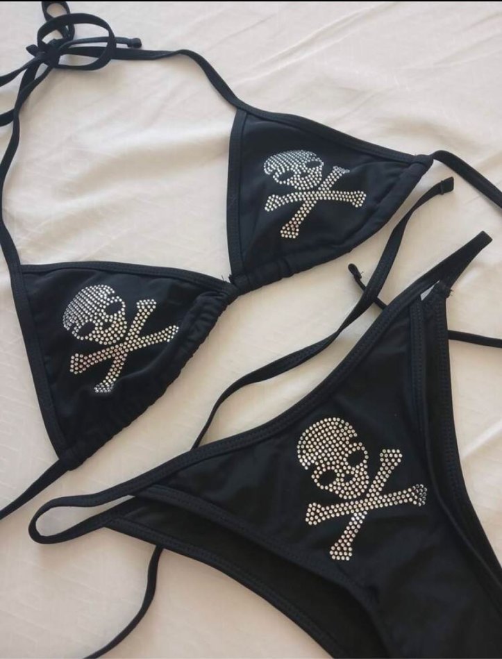 Siyah, pul işlemeli kafatası desenli, askılı ve dar kesim gotik kadın bikini. Cesur parti kombinleri için ideal.