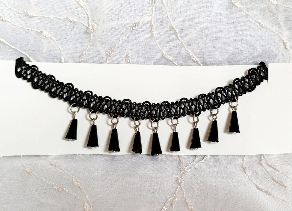 Siyah gotik kolye, nakışlı detaylar ve püskül süslemeleriyle bohem ve retro tarz sunar. Parti için uygun, midi uzunluktadır.