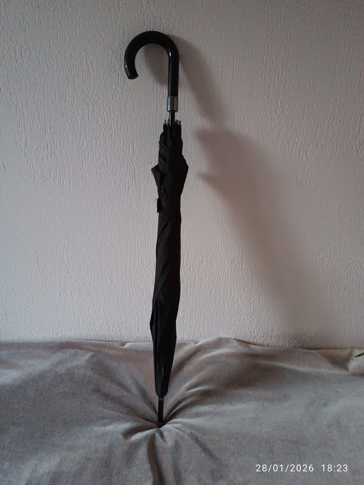 Siyah renkte, gotik tarzda şemsiye. Kavisli sapı ile avant-garde moda ve karanlık estetiği birleştirir.