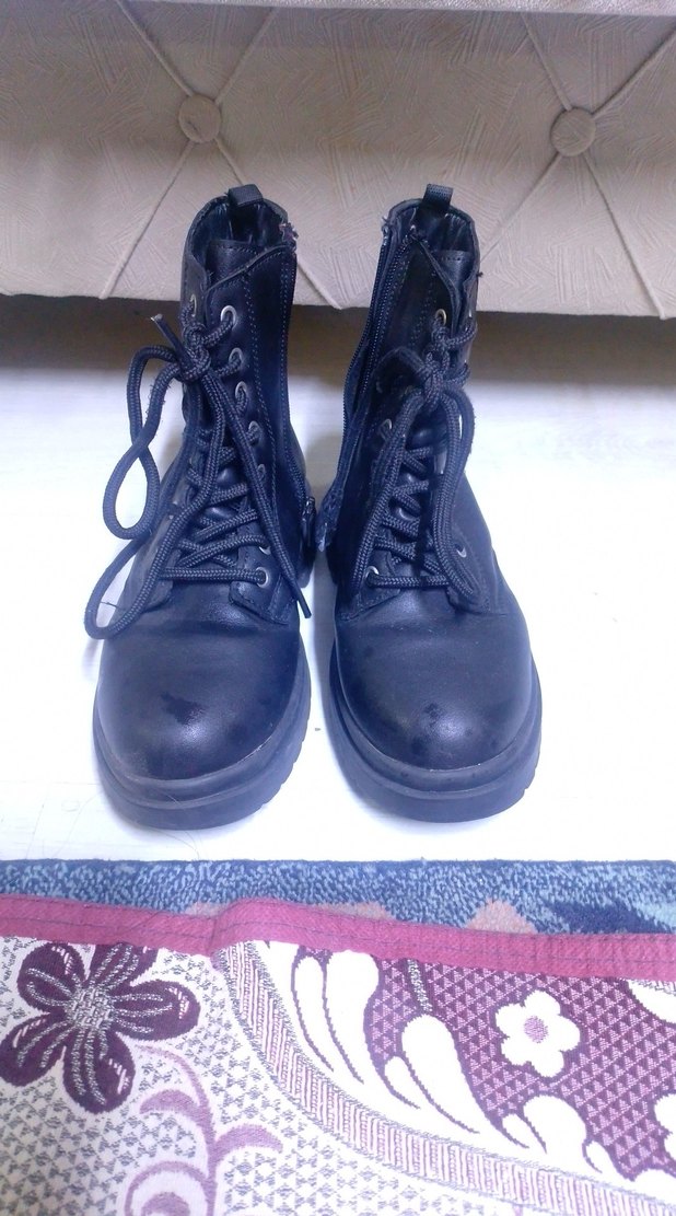 Siyah, lastik malzemeden gotik stil kadın botları. Stiletto topuklu ve bağcıklı, kayış detaylıdır, rock punk havası verir.