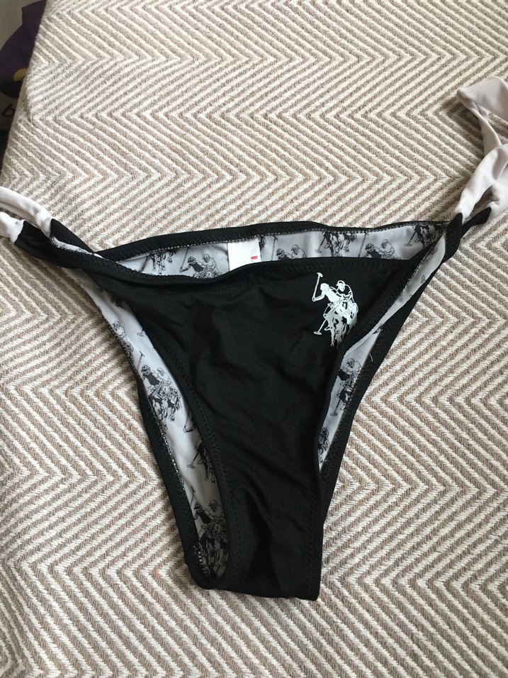 Siyah, esnek yan bantlı, gotik desenli ve strappy tarzda, plaj için uygun bikini altı. Orta uzunlukta ve vücuda oturan kesim.