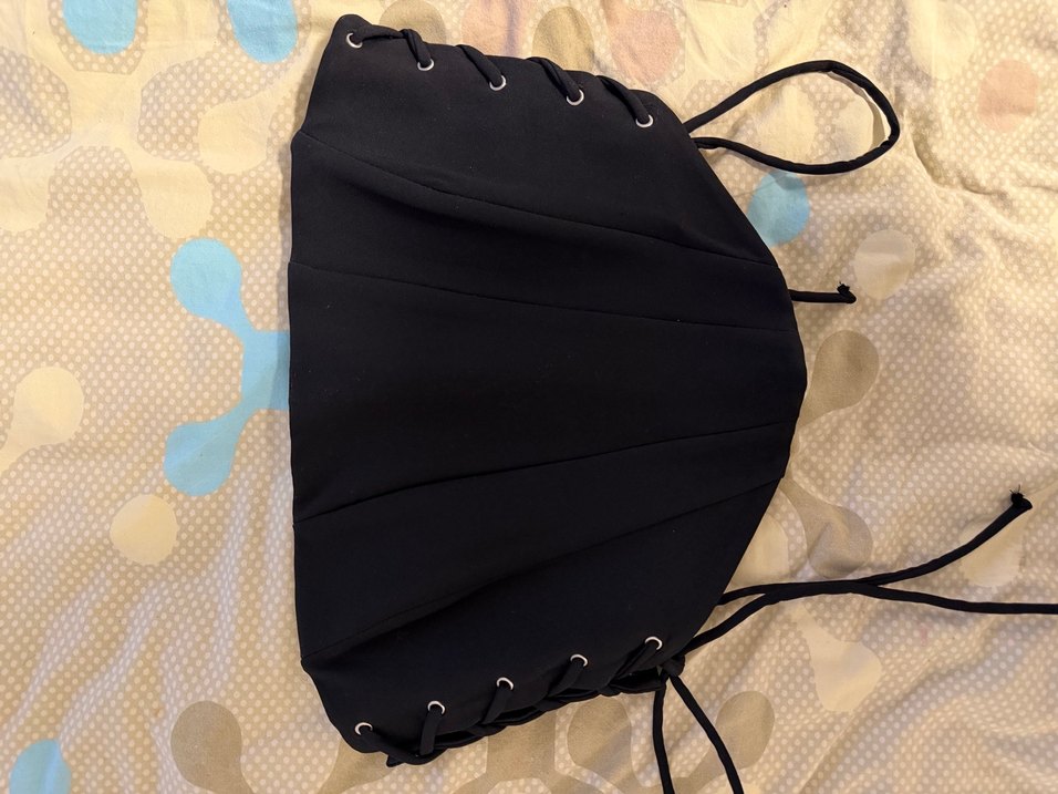 Siyah, straplez, kayış detaylı, fermuarlı ve vücuda oturan sentetik kumaştan yapılmış gotik tarzda bustier. Trendyol 36 beden