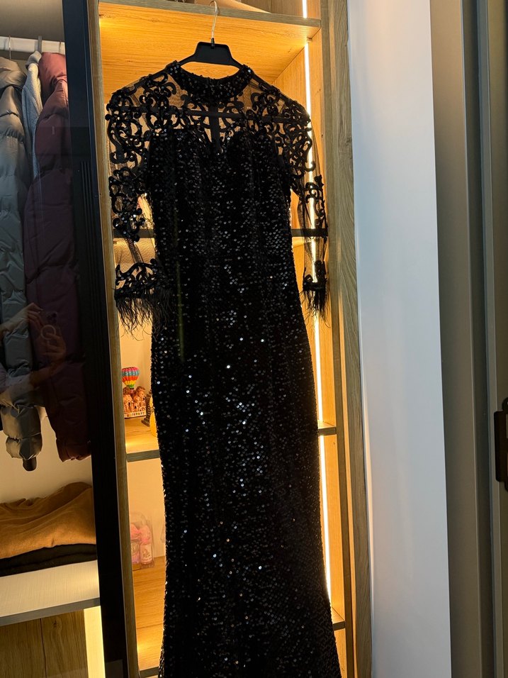 Siyah, drapeli, uzun kollu ve yüksek yakalı, gotik tarzda desenli, klasik şıklıkta uzun ve vücuda oturan abiye elbise. ✨ Bir kez giyildi kusuru yok çok güzel parça
