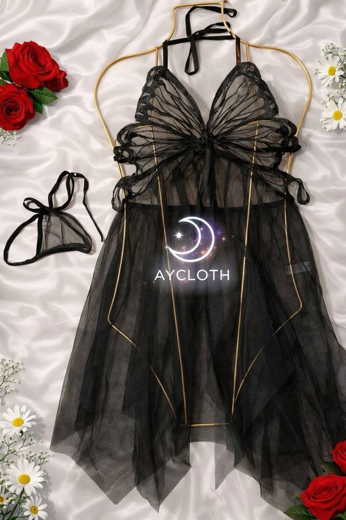 Siyah, askılı ve baskılı detaylara sahip, vücuda oturan gotik tarzda uzun kadın geceliği. İnce tül kumaş ve uyumlu parça dahildir.