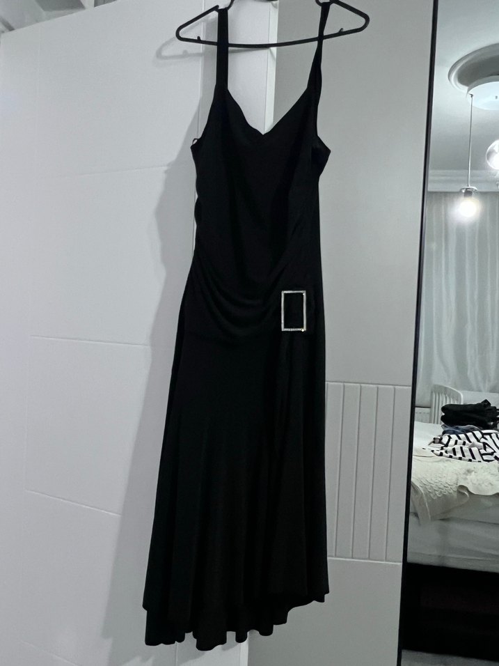 Siyah, straplez ve ince askılı, drapeli uzun abiye elbise. Gotik tarzda, ofis için şık ve fit kesim.