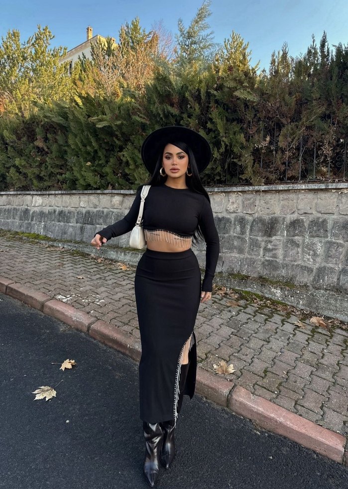 Bu siyah elbise, uzun kollu ve straplez yaka tasarımıyla gotik ve etnik desenleri birleştirir. Dış mekanlar için uygundur, zahmetsiz şıklık sunar.