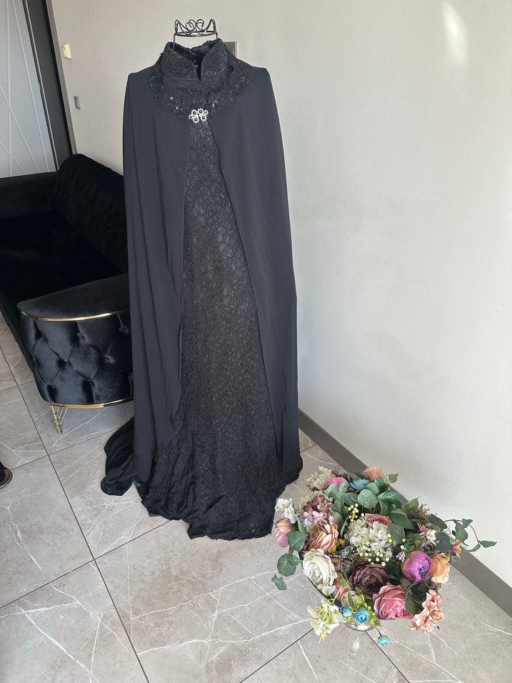 Bu siyah gotik uzun abiye elbise, yüksek yakalı ve kolsuz tasarımıyla dikkat çeker. Salaş ve drapeli yapısıyla klasik bir zarafet sunar, düğün ve özel günler için uygundur. Desensiz ve koyu renklidir.