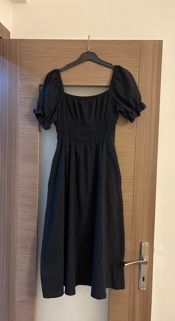 Siyah keten kumaştan, tekne yaka ve kısa balon kollu, drapeli gotik tarzda uzun boy elbisedir. Günlük kullanım için uygundur.
