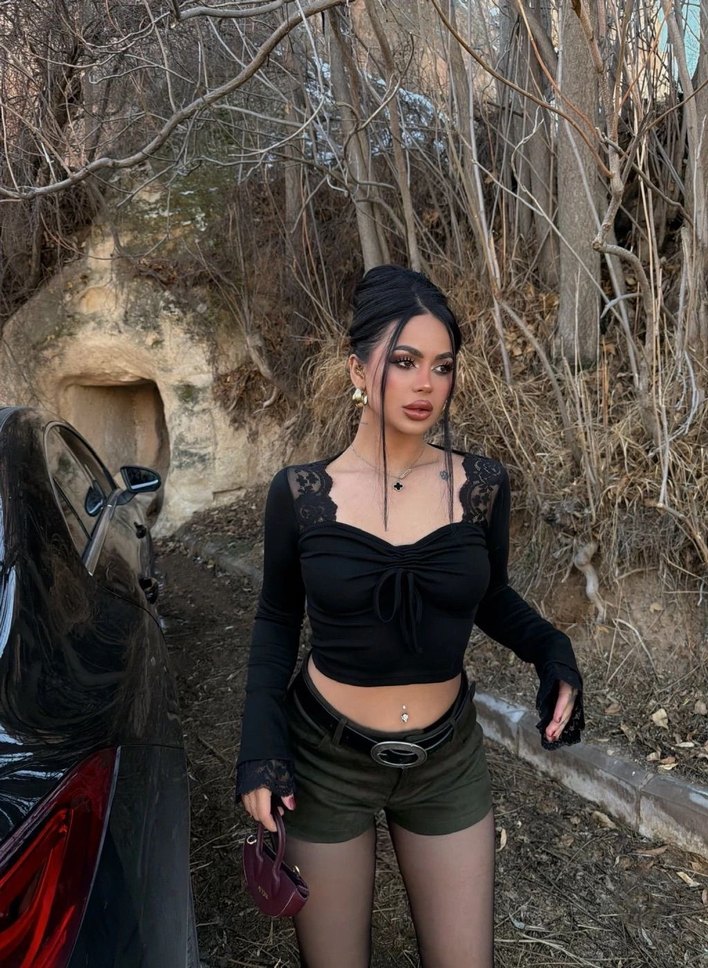Siyah kumaştan yapılmış, straplez yaka ve uzun kollu, mini uzunlukta, vücuda oturan gotik tarzda crop top. Dış mekan kullanımı için uygun.