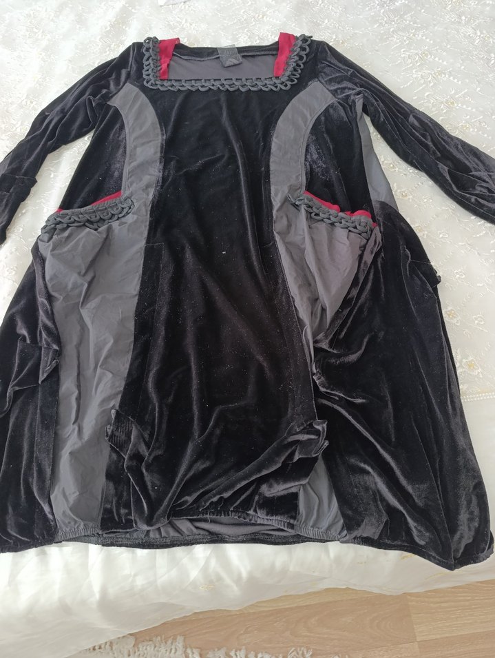 Siyah hamile tunik, uzun kollu, yuvarlak yaka ve bol kesimdir. Yumuşak sentetik kumaştan, drapeli detaylar ve ceplere sahiptir. Gotik parti için uygundur.